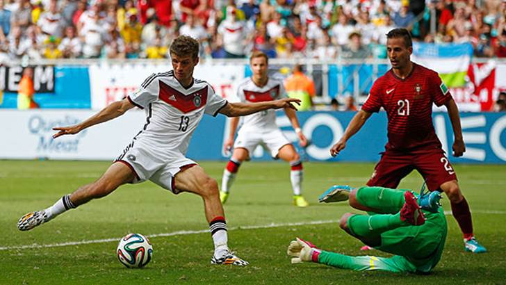 Cinco minutos después, una diagonal de Mesut Özil–escorado a la derecha hoy– lideró una combinación brillantísima entre el del Arsenal, Müller y Götze, que en forcejeo con Joao Pereira terminó en el suelo. Müller lo anotó y desde ahí Alemania condujo sobre raíles.