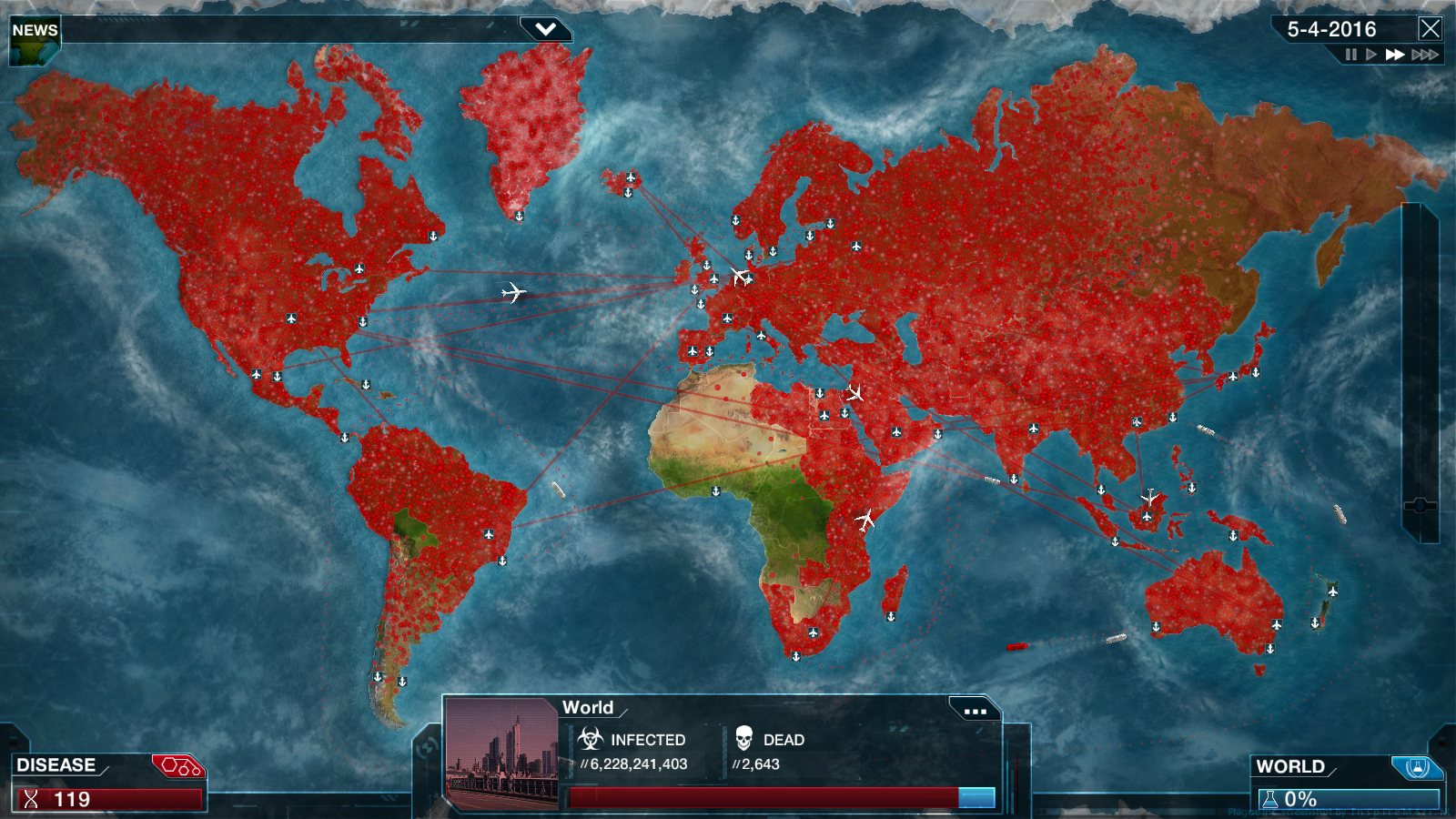 En el juego hay un límite de tiempo antes de que los humanos, que son el oponente, desarrollen una cura para la plaga; solo se puede ganar el juego si se ha contagiado a “todo el mundo”, y se pierde si los hombres logran crear la cura o se aniquila a los enfermos y aún quedan supervivientes.